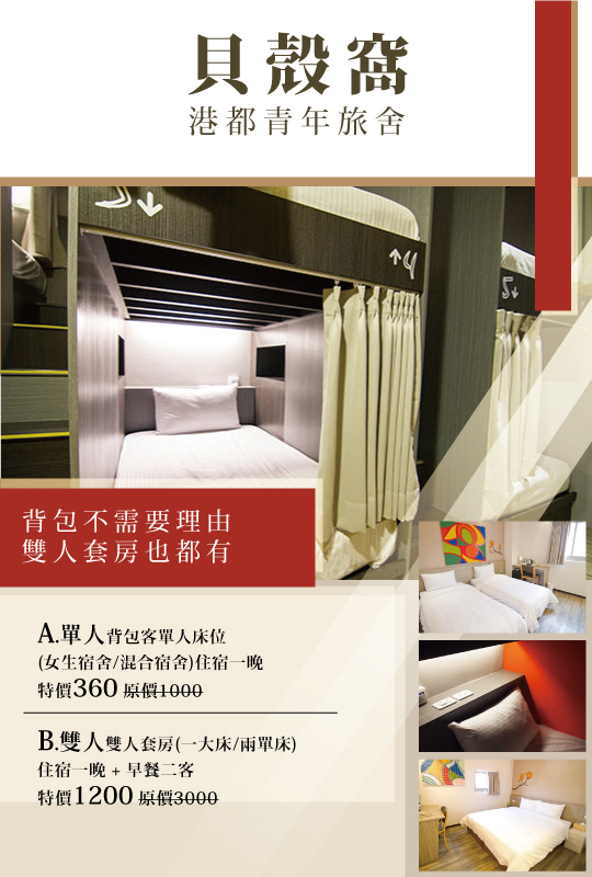 只要360元起,即可享有【高雄-貝殼窩港都青年旅舍】背包不需要理由,雙人套房也都有!A.單人/B.雙人〈含A.背包客單人床位(女生宿舍/混合宿舍) / B.雙人套房(一大床/兩單床) 住宿一晚,B方案另享早餐〉