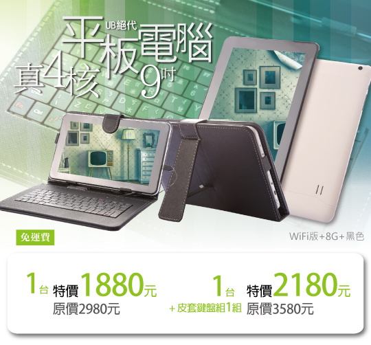 無所匹敵的科技產品!【UB絕代真四核9吋平板電腦(WiFi版+8G+黑色)】讓您花少少的錢就能擁有極大的效能,買回去怎麼用就是讓人超級滿意!只要1880元起,即可享有UB絕代真四核9吋平板電腦一台(WiFi版+8G+黑色),另有皮套鍵盤組方案可選