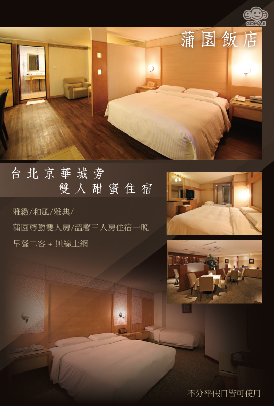 只要1880元,即可享有【台北-蒲園飯店】不分平假日皆可使用!台北京華城旁~雙人甜蜜住宿〈含(雅緻/和風/雅典/蒲園尊爵雙人房/溫馨三人房)住宿一晚 + 早餐二客 + 無線上網〉