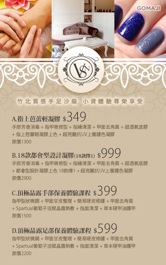 頂極晶露保養體驗,將您日常摩擦累積與自然生長出來的多餘甘皮、硬皮一層一層除去,還原指甲原本的美麗面貌,並採用專業品牌Spartual葡萄子活賦晶露熱敷,使肌膚更加細膩光華~提供手足不同專案供您需求選擇。.jpg?1482990711&ver=20250714)