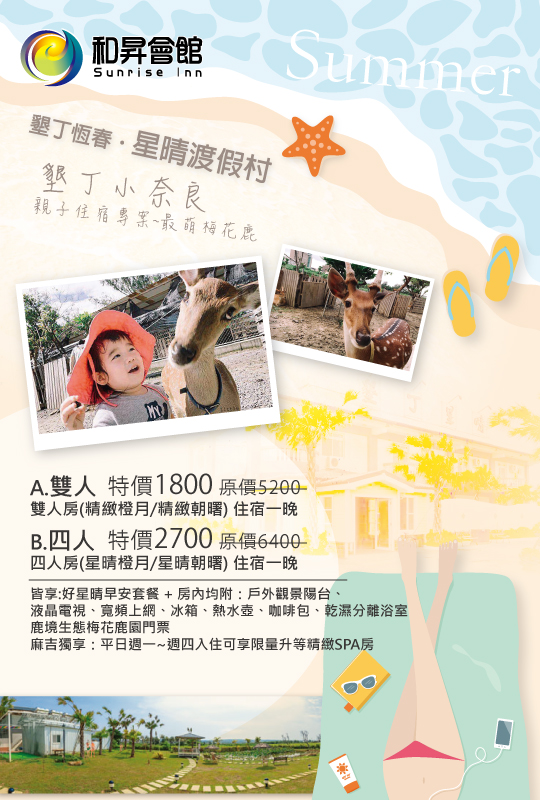 只要1800元起,即可享有【和昇會館-墾丁恆春?星晴渡假村】墾丁小奈良親子住宿專案~最萌梅花鹿~A.雙人/B.四人〈含A.雙人房(精緻橙月/精緻朝曙)/B.四人房(星晴橙月/星晴朝曙) 住宿一晚 + 好星晴早安套餐 + 鹿境生態梅花鹿園門票 + 房內均附:戶外觀景陽台、液晶電視、寬頻上網、冰箱、熱水壺、咖啡包、乾濕分離浴室〉麻吉獨享:平日週一~週四入住可享限量升等A.精緻SPA雙人房/B.精緻SPA四人房