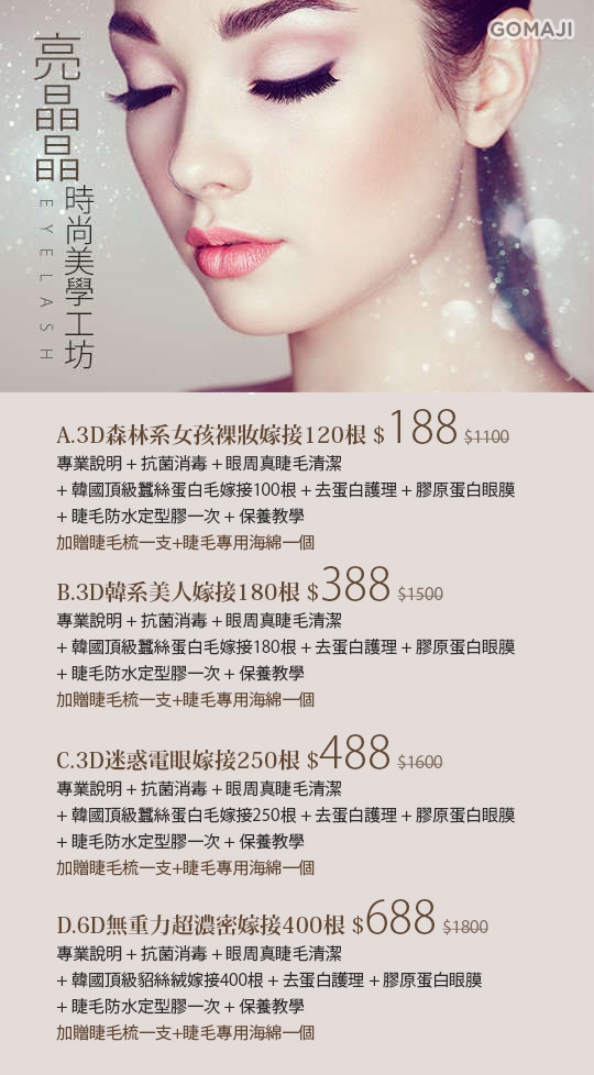 A.3D森林系女孩裸妝嫁接120根 / B.3D韓系美人嫁接180根 / C.3D迷惑電眼嫁接250根 / D.6D無重力超濃密嫁接400根
