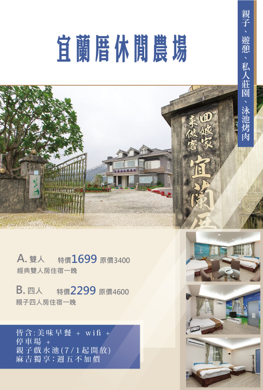 只要1699元起,即可享有【宜蘭冬山-宜蘭厝休閒農場】親子、遊憩、私人莊園、泳池烤肉一次享有A.雙人/B.四人專案〈含A.經典雙人房/B.親子四人房 住宿一晚 + 美味早餐 + wifi + 停車場 + 親子戲水池(7/1起開放)〉麻吉獨享:週五不加價