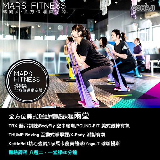 【MARS FITNESS】全方位美式運動二堂199元!TRX懸吊訓練、BodyFly空中瑜珈、POUND-FIT美式鼓棒有氧、KettleBell核心壺鈴、Ugi馬卡龍美體球等8項體驗課程!